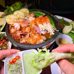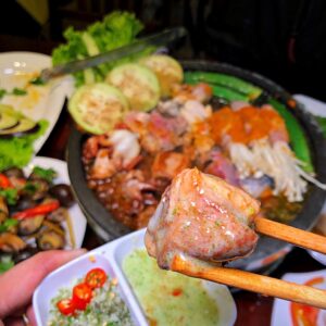 – Sau khi rảo đều dầu và bơ rồi chỉ cần trải thịt, bạch tuộc, bò cuộn nấm kim châm, tôm… Nước thịt ngọt, đậm đà thấm vào những miếng thịt tươi rói, nướng xì xèo chín thơm phức luôn